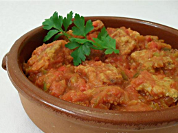 Corta el bonito en dados, salpimiéntalo y rebózalo en la harina.Llena una sartén pequeña con aceite de oliva suficiente para cubrir los dados de bonito hasta la mitad.Cuando el aceite esté bien caliente, fríe en el los dados de bonito 2-3 minutos por cada lado, hasta que estén dorados.Reserva los dados fitos sobre papel secante. Corta la cebolla y los pimientos en trozos pequeños. En una sartén echa un par cucharadas de aceite y sofríe las verduras hasta que estén tiernas y la cebolla haya cambiado de color. En ese momento echa un poco de sal y el vino blanco y deja que se evapore. Tritura los tomates y tamízalos. Pasa el sofrito de verduras a una cazuela de barro, y añade el tomate triturado y la hoja de laurel. Salpimienta al gusto y échale un par de cucharaditas de azúcar para reducir la acidez del tomate. Deja que la salsa de tomate reduzca y espese a fuego lento (lo que puede llegar a tardar hasta 20-30 minutos) y listo. Incorpora los dados fritos de bonito, déjalo cocer por tres o cuatro minutos más para que se mezclen los sabores. Llévalo del fuego directo a la mesa.