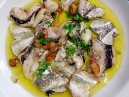 Colocamos en la cazuela las antxoas, al cabo de veinte segundos damos la vuelta a las antxoas. Transcurrido otros veinte segundos retiramos la cazuela del fuego. Rociamos con un poco de sal y unas gotas de vinagre.